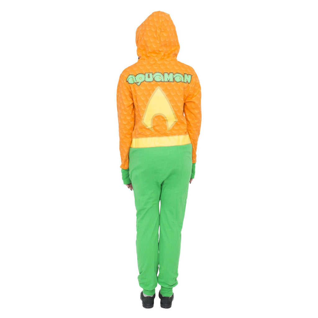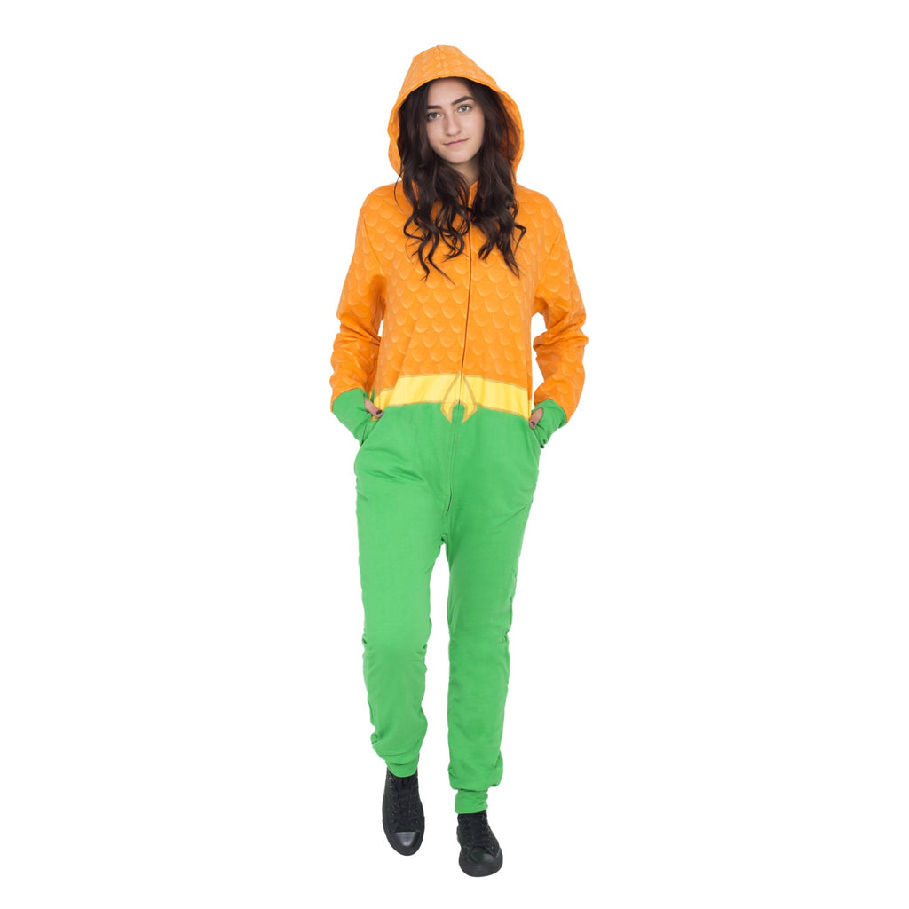 The Aquaman Women's DC Comics Hooded One Piece Pajama Onesie is a colorful and cozy addition to any woman's sleepwear collection. Featuring Wonder Woman as the character, this onesie has long sleeves and a hood for added warmth during the winter and fall seasons. Made of soft fleece polyester material, this zip-closed pajama is machine washable for easy care. The orange color and comic theme make it a fun and stylish choice for any DC comic fan.