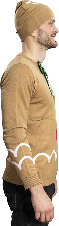 - Playful Holiday Design: Embrace the holiday spirit with this Gingerbread Man sweater and hat set, featuring a festive design that makes it look like you’re dressed as a life-sized gingerbread cookie. Ideal for holiday parties, themed events, or even a playful take on Halloween.