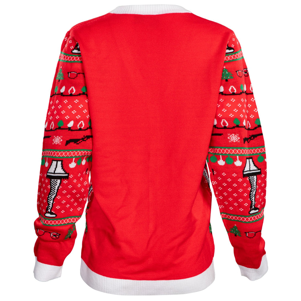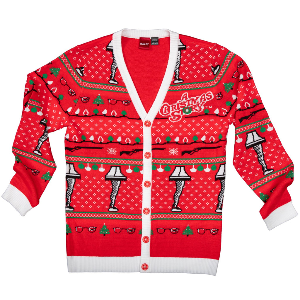 The A Christmas Story Leg Lamp Button Up Cardigan is a festive and cozy sweater perfect for the holiday season. Made from acrylic knit fabric in green, red, white, and black colors, this cardigan features a regular fit and is machine washable for easy care. The design is inspired by the iconic Leg Lamp from the classic holiday movie A Christmas Story, making it a fun and nostalgic addition to any Christmas wardrobe. Mad Engine is the brand behind this unisex adults' sweater, ensuring quality and style for the Christmas season.