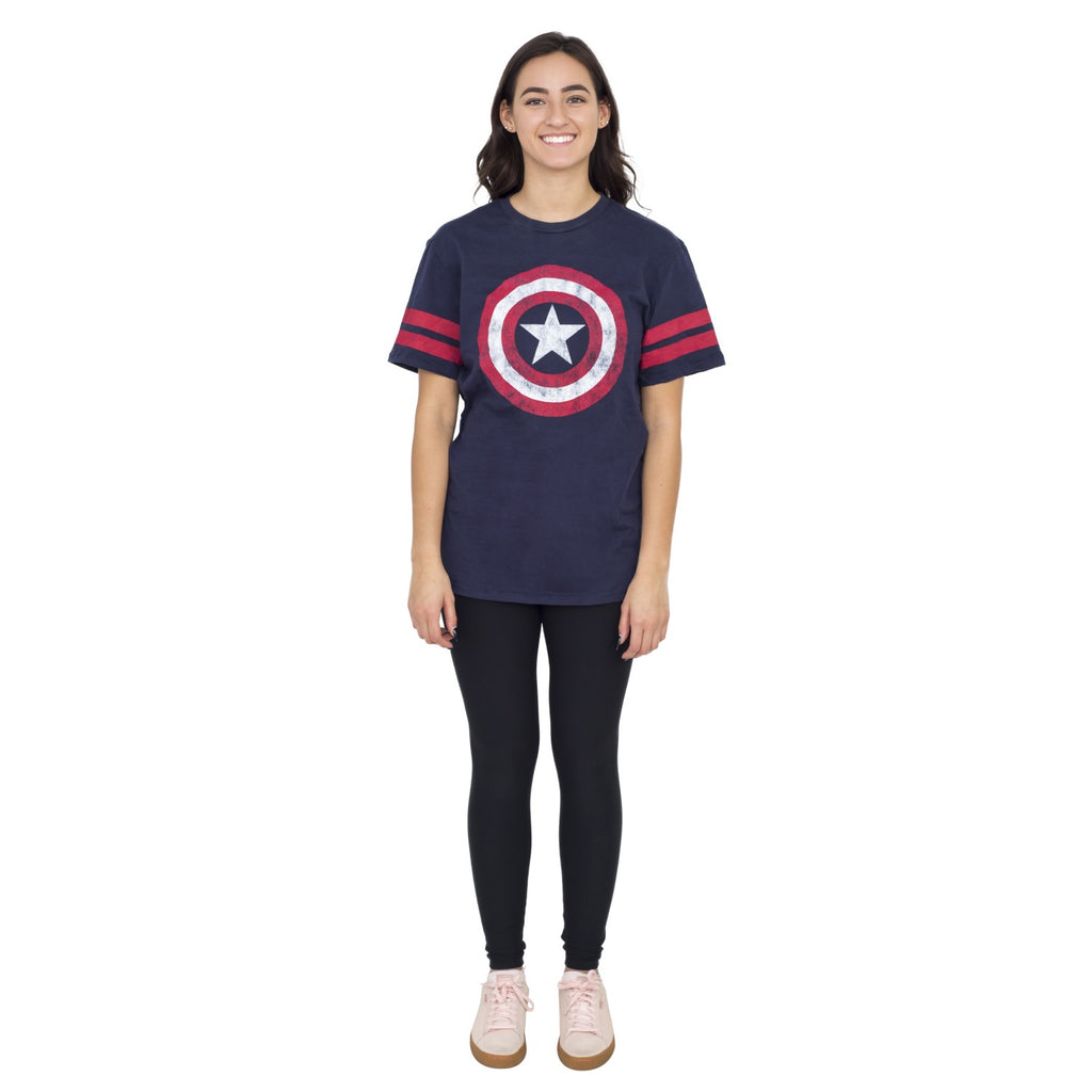 Who is everyone's favorite American super hero? It's Captain America, of course! With his impenetrable shield, he just oozes Americana. If Cap is your favorite super hero, show it off in style with this officially licensed Marvel t-shirt. This Captain America t-shirt features a distressed print of the shield for an awesome retro look and feel, making it the perfect choice for any Marvel fan!