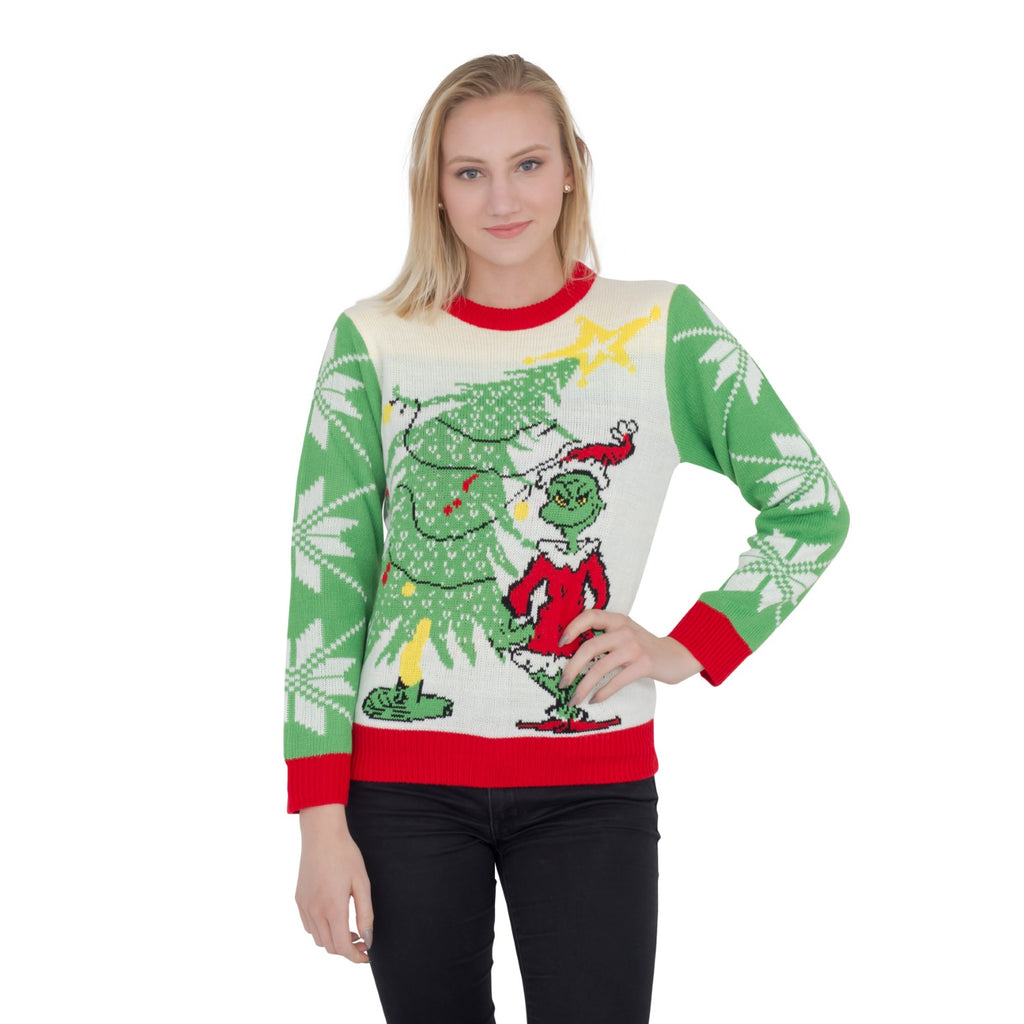 Are you looking for a holiday sweater of questionable quality that celebrates one of your favorite Christmas specials? If so, look no further than this ugly Christmas sweater inspired by the tale of How the Grinch Stole Christmas! Featuring the Grinch right next to one of the Christmas trees that he stole, this officially licensed Dr. Seuss sweater is sure to please any fan of either the book or the animated special. Who says that you can’t have a fun holiday sweater for your next ugly Christmas sweater contest? Show some love for Dr. Seuss with this awesome Grinch sweater!