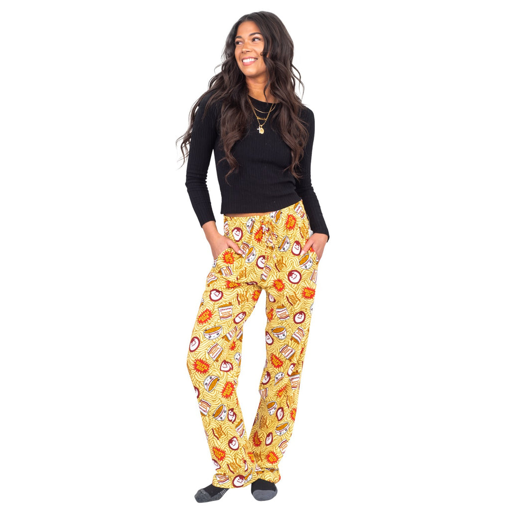 The Maruchan Toss Noodle Adult Unisex Christmas Lounge Pants are perfect for the holiday season. These long pants feature a graphic print of Maruchan noodles, with accents from the Costume Agent brand. Made from lightweight polyester material, these lounge pants are machine washable and come in a vibrant multicolor design. Sizing in 2XL, these pants are ideal for both men and women looking for cozy yet stylish sleepwear during the winter, fall, and spring seasons.