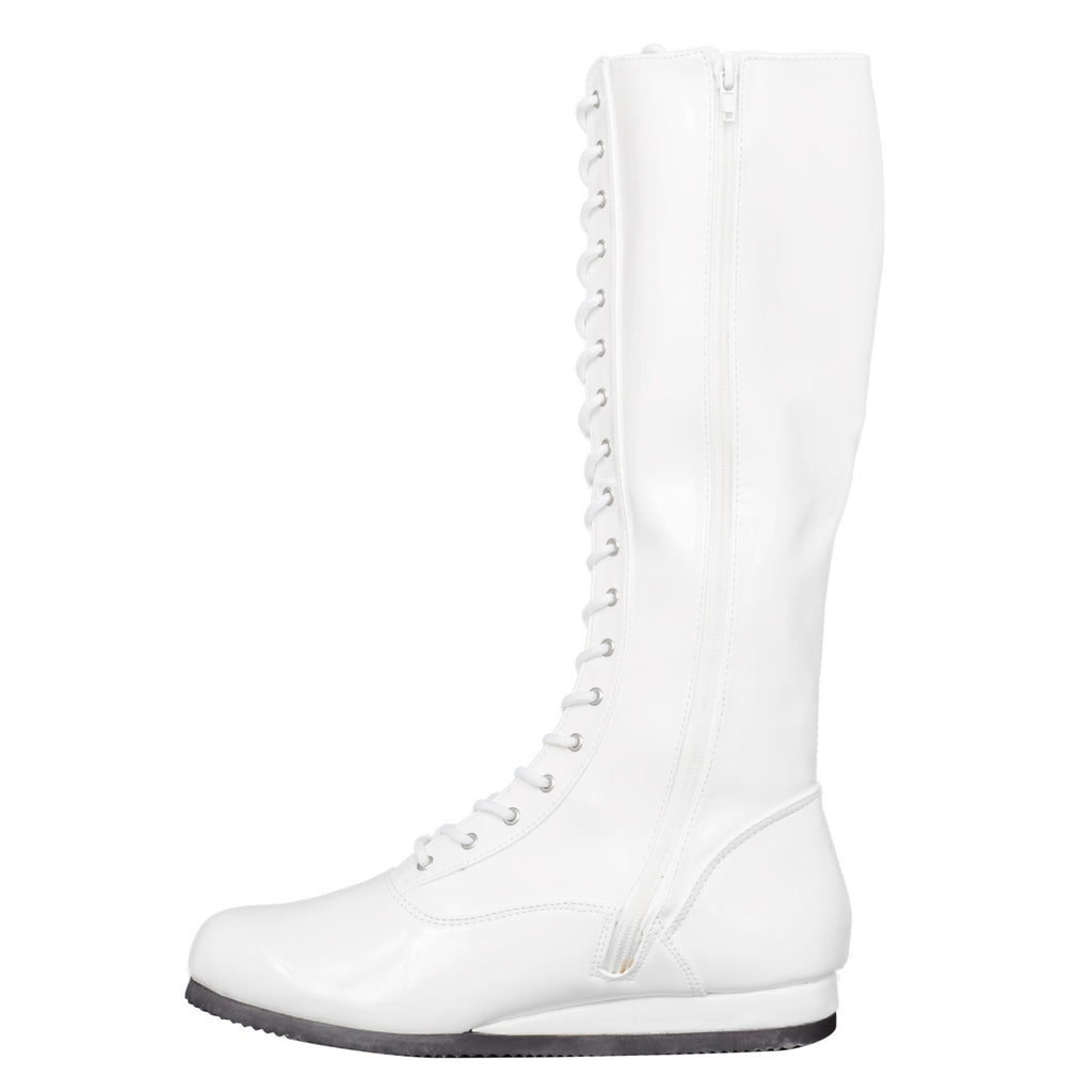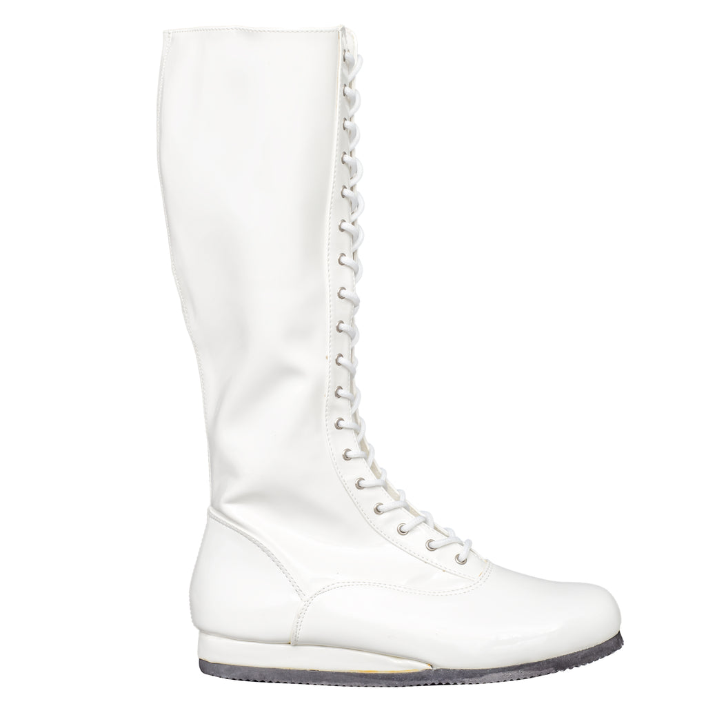 A WWF Superstar doesn't wear Nikes. These babies are custom wrestling boots made of a shiny vinyl. Each wrestling boot laces up the front and includes a zipper for getting in and out of it quickly. The sole is black and is made of a light-weight foam material. These costume wrestling boots are perfect for completing your Hulk Hogan or Ultimate Warrior costume. They aren't so great for actual wrestling. This is the perfect Wrestling Halloween costume.