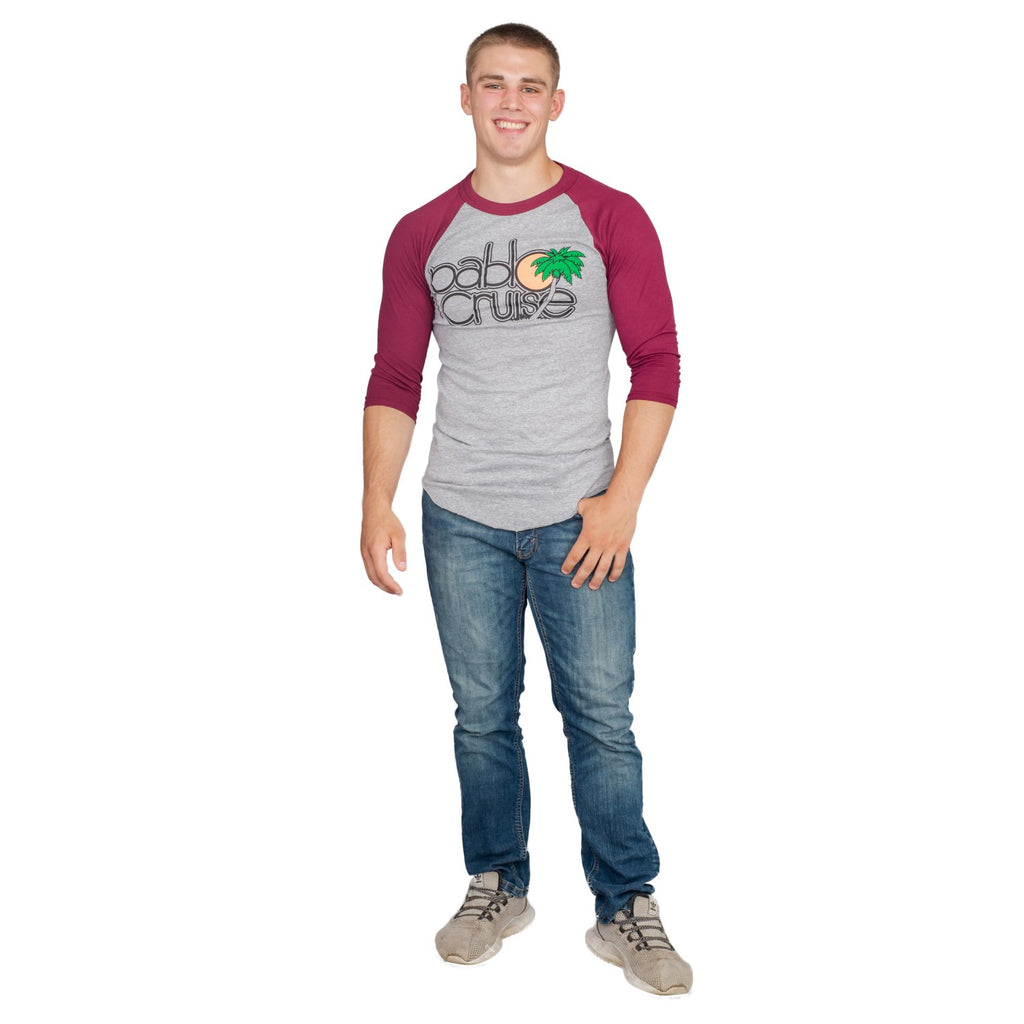 Crafted in a classic raglan style, this tee combines a gray body with maroon sleeves, lending it a sporty yet casual aesthetic that’s perfect for any laid-back occasion. The soft, durable fabric blend ensures that the shirt provides comfort and breathability, suitable for all-day wear whether you're out with friends, at a themed party, or just relaxing at home.