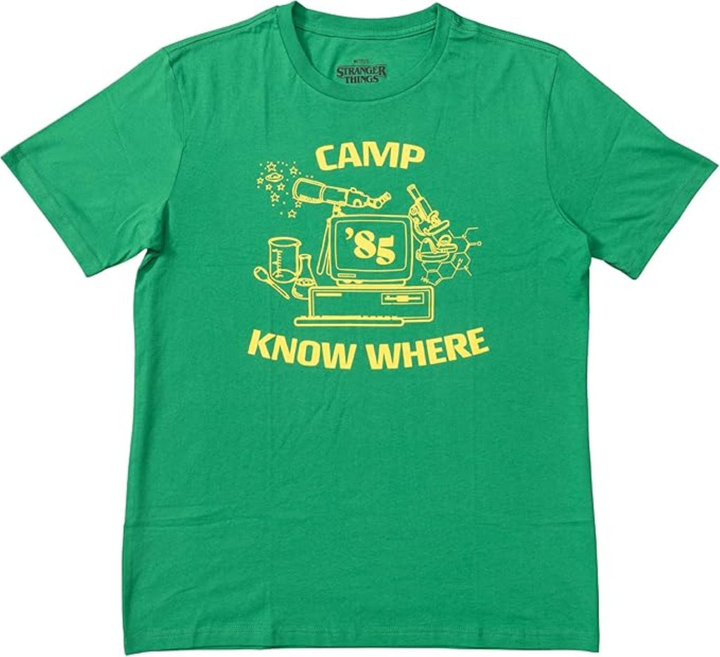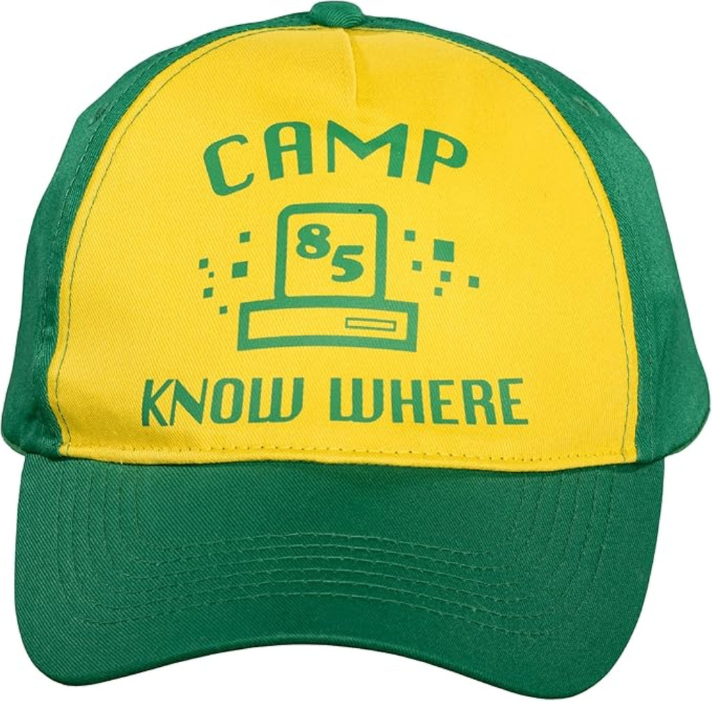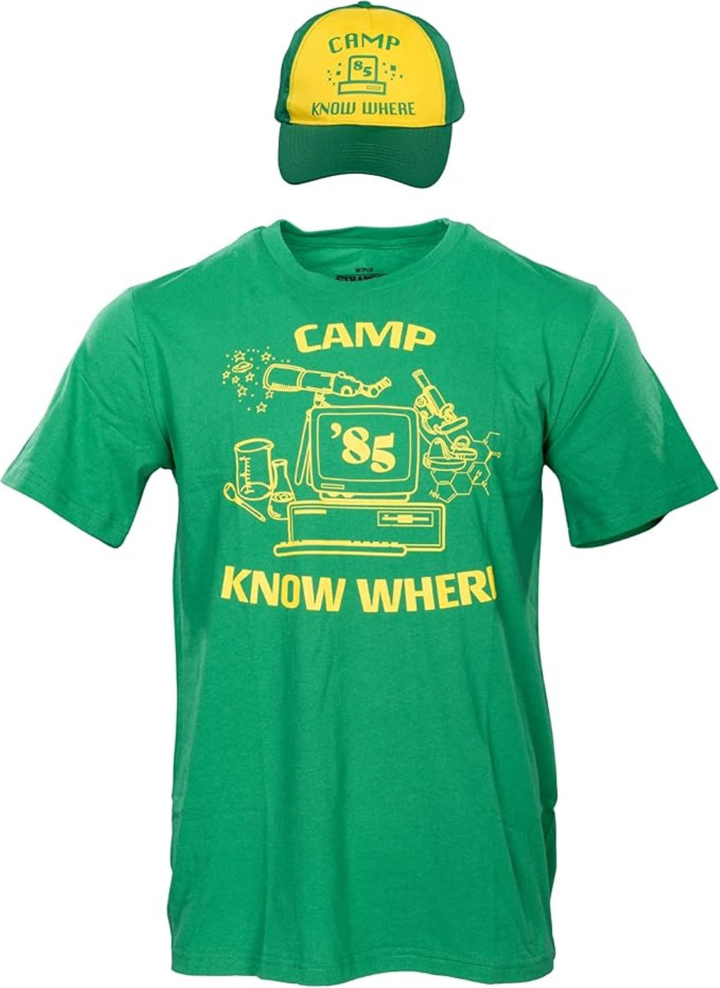 - Officially licensed Stranger Things costume set featuring Dustin Henderson’s iconic “Camp Know Where” short sleeve green t-shirt and matching camp hat.