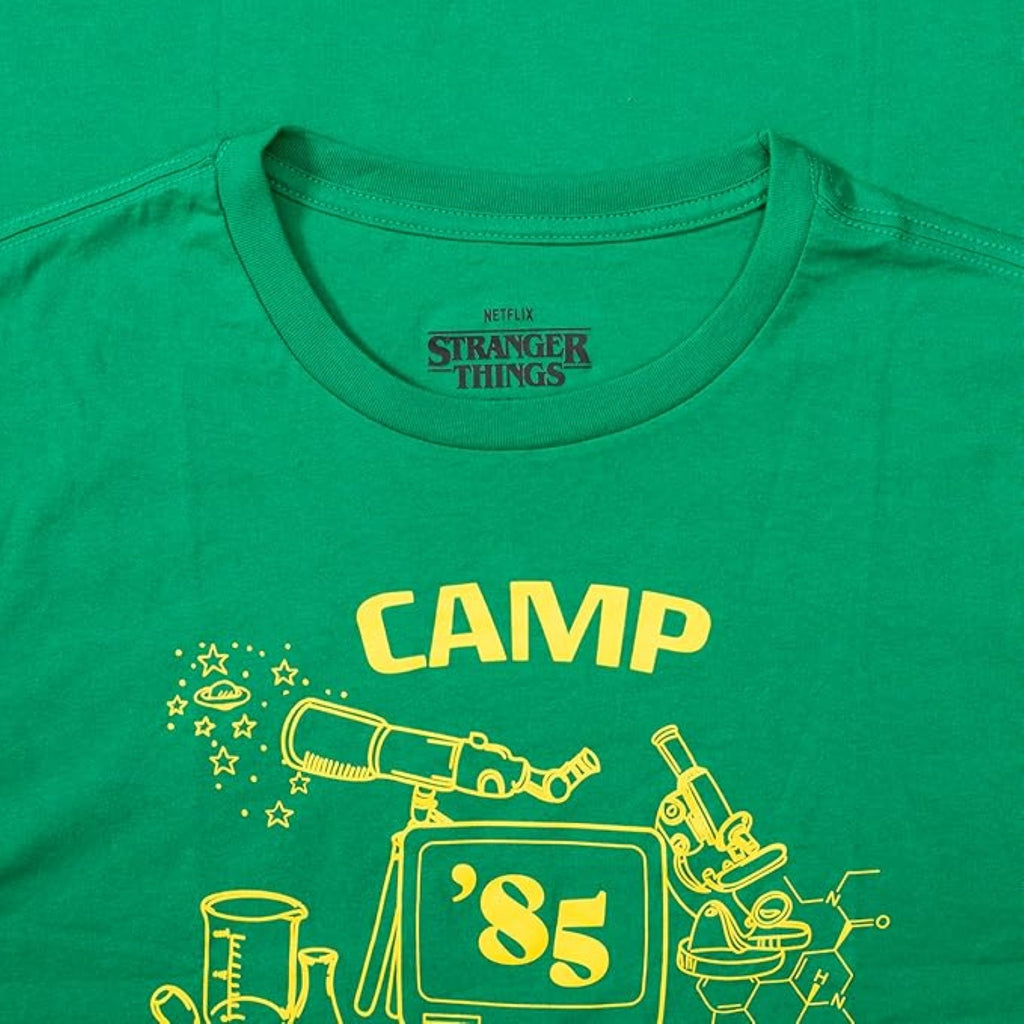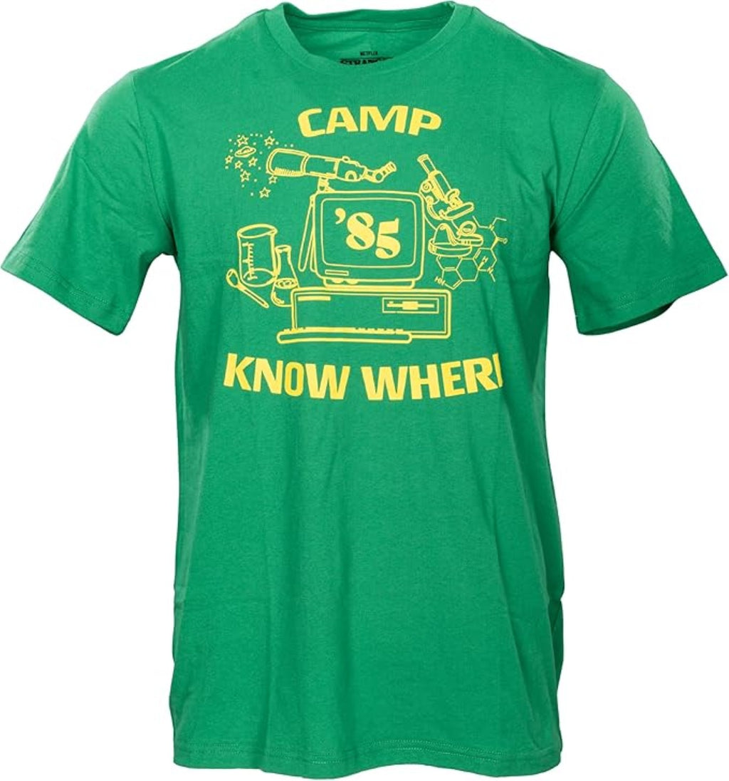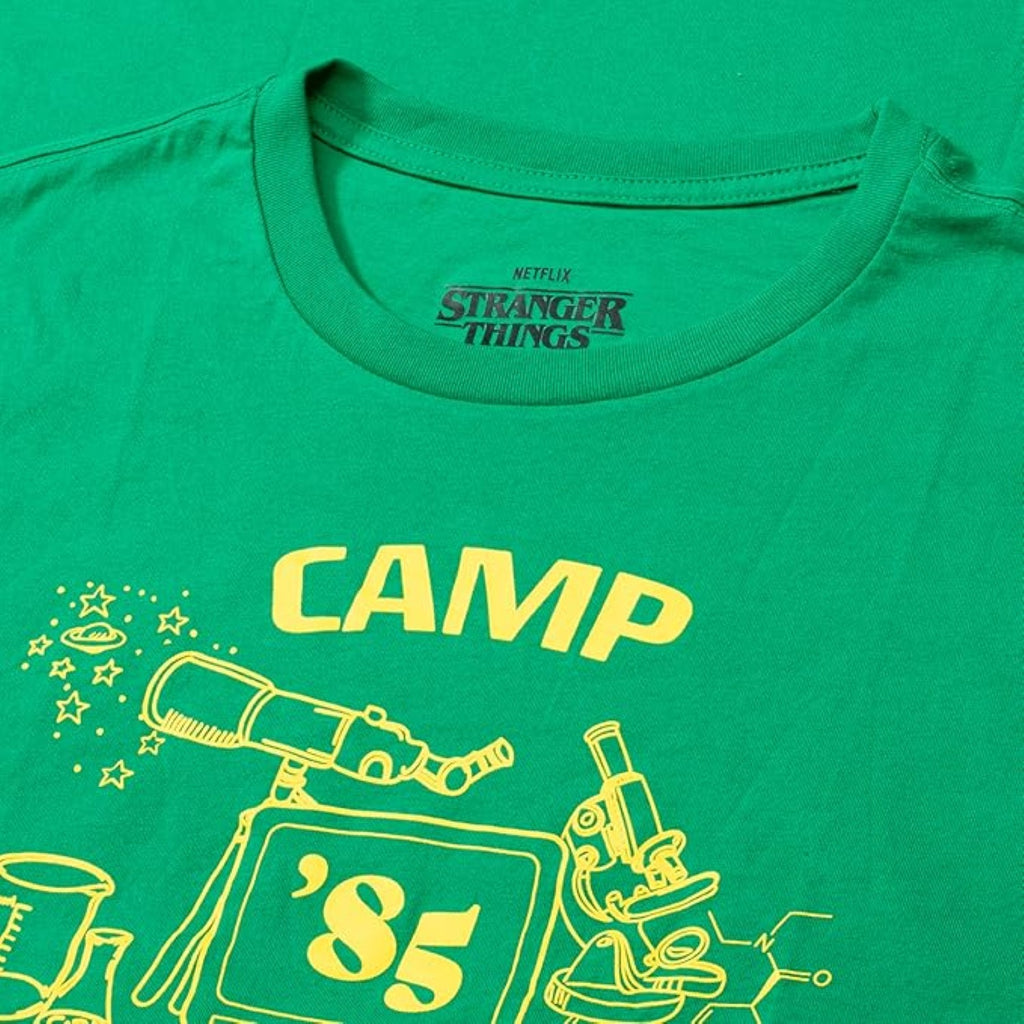 - Officially licensed Stranger Things costume set featuring Dustin Henderson’s iconic “Camp Know Where” short sleeve green t-shirt and matching camp hat.