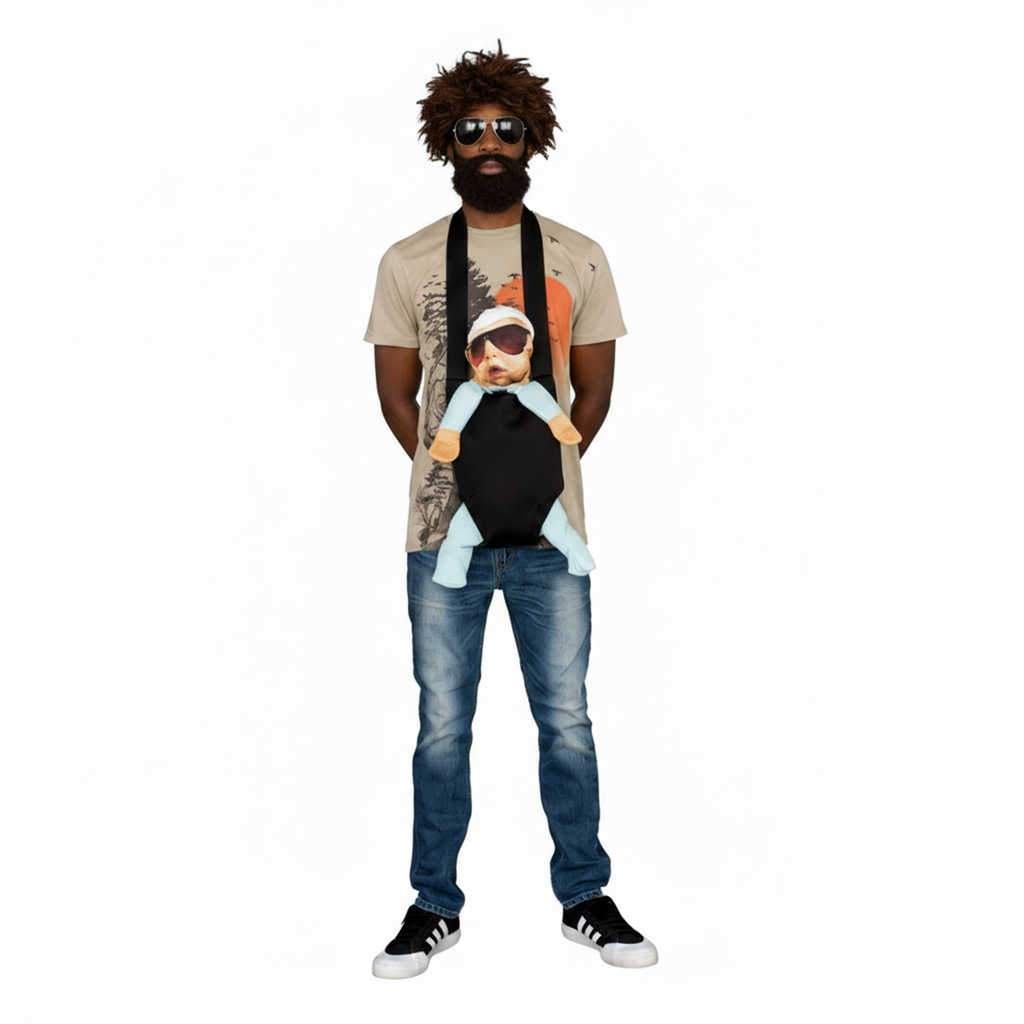 - Includes: Includes: t-shirt, a pair of regular glasses, a plush baby carrier (you can add padding to make the baby plump) with a fake Carlos baby with a screen print face, a wig and a beard and mustache.