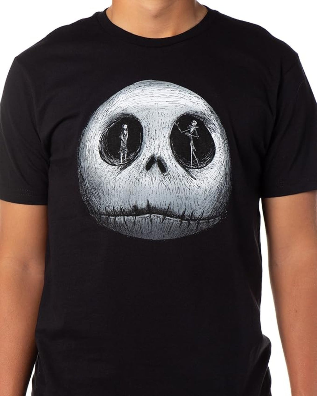 - Comfortable Fit with Eye-Catching Artwork: This men's tee features a relaxed cut designed for all-day comfort, whether worn on its own or layered. The standout graphic shows Jack Skellington’s face with Jack and Sally detailed inside the eye sockets for a unique design. The lightweight cotton material provides breathable comfort for everyday wear.