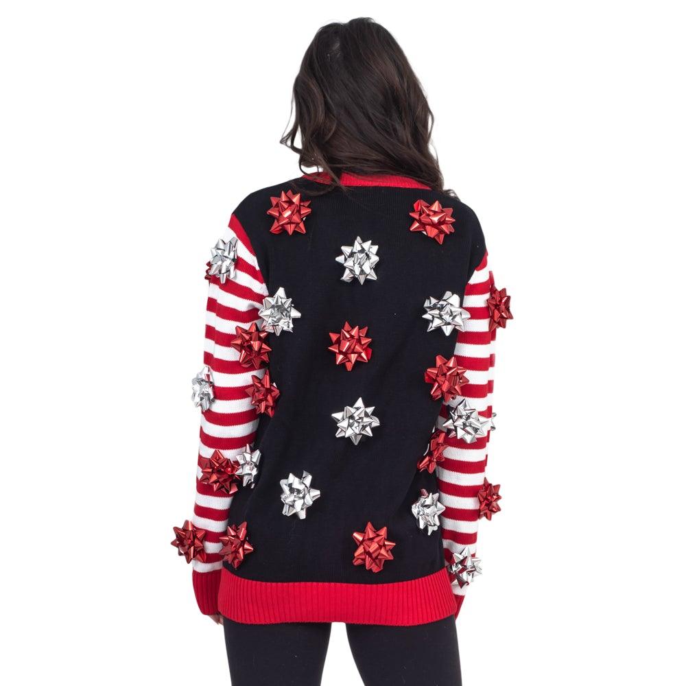 - This button-up Ugly Christmas Cardigan Sweater features silver and red gift wrapping bows, two front pockets, and red and white sleeves.